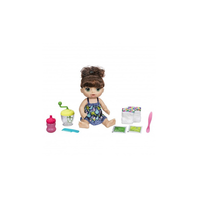Śliczna lalka, która zachowuje się jak prawdziwy dzidziuś! Potrafi pić, robić siusiu i kupę. Przygotuję jedzenie dla niej za pomocą specjalnego blendera.Zestaw zawiera:ubraną lalkę blender z ręczną korbą i miską 2 pieluchy 2 saszetki z jedzeniem butelkę miseczkę łyżeczkę grzebień
