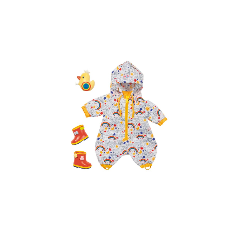 Zestaw Deluxe Outdoor Fun Baby Born firmy Zapf. Zestaw na deszcz dla lalki Baby Born. Zawiera kombinezon przeciwdeszczowy, kalosze oraz zabawkę. Wykonany z najwyższej jakości materiałów. Wysokość lalki 43 cm Wiek 3+