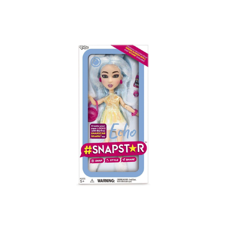 Lalka Echo z serii Snap Star firmy TM Toys. Lalki, które uwielbiają selfi i mediów społecznościowych. Każda z nich jest inna i wyróżnia się swoim wyglądem. Zestaw zawiera lalkę, stojak do lalki, zestaw ubrań oraz akcesoriów, tło dla lalki kompatybilne z aplikacją.