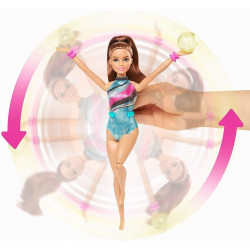 Małe marzycielki mogą bawić się oraz robić piruety z lalką Teresą i jej gimnastycznym zestawem Barbie. Doczep do jej talii niebieski pierścień i obróć go, by pomóc lalce zrobić „gwiazdę” lub salto. A gdy przyczepisz specjalną różową obręcz do jej nadgarstka, Teresa zacznie nią obracać! Szczeniaczek Teresy uwielbia wspólne ćwiczenia. Naciśnij głowę figurki, by zobaczyć, jak macha wstążkami, lub ustaw ją na trampolinie i pomóż wzbić się w powietrze. Teresa potrafi zginać kolana, a zestaw akcesoriów do gimnastycznego treningu zawiera także maczugi do żonglowania, wstążkę, butelkę z „wodą” oraz piłkę. Gdy uda się jej zdobyć najwyższą notę, można obdarować ją złotym medalem (znajduje się w zestawie).