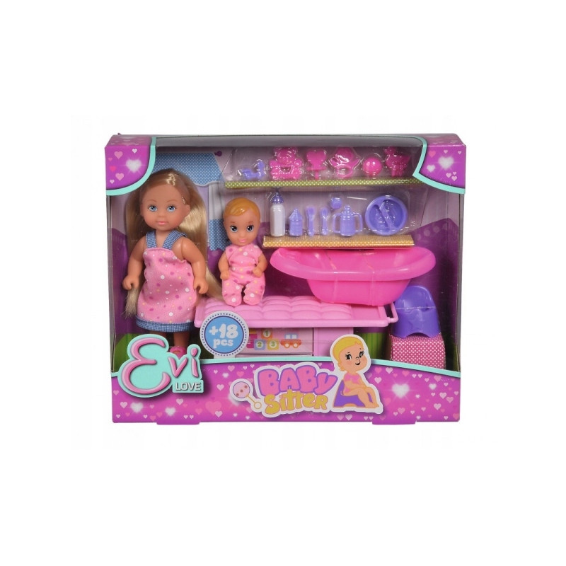 Evi Opiekunka niemowlaka. Laleczka Evi jako opiekunka niemowlaka ma do dyspozycji stolik do przewijania, nocnik, wanienkę i wiele akcesoriów do pielęgnacji.