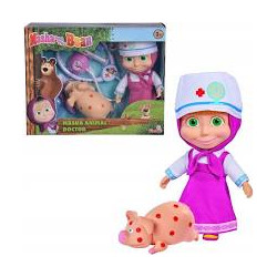 Dzieci uwielbiają Maszę. Lalka Masza w stroju doktora z chorą świnką, 23cm. Miękka lalka w letniej sukience, czapce lekarskiej wraz z stetoskopem i akcesoriami. Dołączona chora świnka z wysypką, która znika po pocieraniu ciepłą wodą (działa pod wpływem zmiany temperatury). Zabawa tym zestawem wyzwoli w dziecku poczucie odpowiedzialności, opiekuńczości.