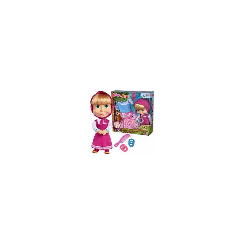 W zestawie znajdziemy dwie inne sukienki do przebrania Maszy: biało-niebieską sukienkę w stylu marynarskim oraz różową sukienkę w kropki, a także grzebień oraz 4 gumki do włosów, aby uczesać Maszę. Gdy naciśniesz w odpowiednim miejscu na brzuszku wygrywa melodię. Zabawa z lalką wyzwoli w dziecku poczucie opiekuńczości, wpłynie na wyobraźnię. Wiek 3+.