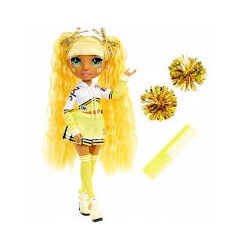 Lalka Rainbow High Cheerleaderka - Sunny Madison ma żółte włosy, sportowy strój: bluzę, spódniczkę mini, podkolanówki, sportowe obuwie, kokardę, klamerki do włosów, grzebień, pompony. Stanie się wierną towarzyszką dziewczęcych zabaw.