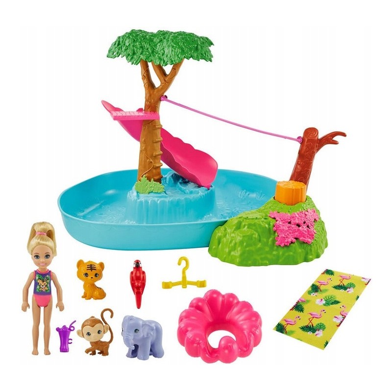 Barbie Chelsea wakacyjna przygoda w dżungli. Baw się razem z Chelseą i jej egzotycznymi zwierzątkami w basenie, na zjeżdżalni oraz linie. Możesz również usiąść na ręczniku i ochłodzić się napojem. Zestaw zawiera lalkę, zwierzątka oraz akcesoria tematyczne.