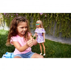Barbie ubrana w kwiecistą, fioletową sukienkę. Stylizację dopełniają błękitne okulary oraz stylowe, białe pantofelki. Lalka posiada długie blond włosy, niebieskie oczy oraz pasujący do nich błękitny makijaż.