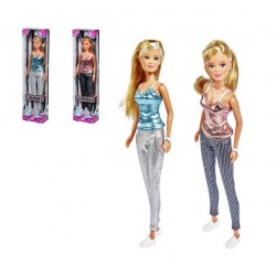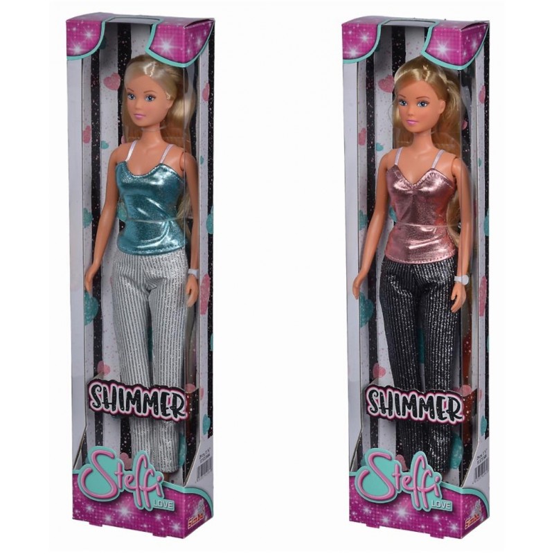 Laleczka Steffi ubrana została w połyskujący top (niebieski lub różowy) i spodnie w stylu sportowej elegancji (czarne lub szare). Na jej stopach znajdują się sportowe obuwie, a na nadgarstku zegarek, który uzupełnia całą stylizację. Zabierz swoją laleczkę na spotkanie ze znajomymi.