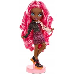 Lalka modowa, która kocha róż. Ma dwa komplety ubranek: różowo-czarna dżinsowa kurtka z haftem w róże na rękawkach, t-shirt, sukienka z metalicznym nadrukiem MAGIC, skarpetki, parę modnych butów,