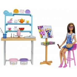 Lalka Barbie w pracowni artystycznej. Wyzwól swoją kreatywność przy tworzeniu wyrobów z „ceramiki” i „malowaniu” obrazów. Najpierw wyjmij masę plastyczną Barbie z pojemnika i uformuj ją w kulkę. Umieść masę w formie na wazon. Naciśnij i zobacz, co udało Ci się stworzyć! Ustaw wazon na podstawce obrotowej i wybierz stempelek (serduszka lub gwiazdki). Obróć podstawkę, aby zrobić wzorek w masie, a po zakończeniu pracy zaprezentuj swoje dzieło na półce.