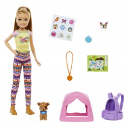 Lalka Stacie jest gotowa na przygody na świeżym powietrzu w koszulce z grafiką kempingową, spodniach z zabawnym nadrukiem i sportowych butach turystycznych. Zestaw zawiera szczeniaka i akcesoria, które inspirują do zabawy w odgrywanie ról, takie jak transporter, namiot dla zwierzaka, kompas i mapa.