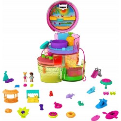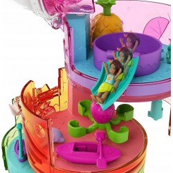 Przeżywaj radosne chwile w aquaparku. Znajdziesz tu trampolinę, basen z ananasem (wlej wodę, naciśnij ananasa i patrz, jak woda chlupie w basenie), truskawkową karuzelę, basen z pomarańczą (wlej wodę i naciśnij pomarańczę, aby pojawiły się bąbelki) oraz dwie zjeżdżalnie. Niektóre akcesoria mają zaczepy, które umożliwiają przyczepienie ich w różnych miejscach zestawu, zwiększając możliwości zabawy. Baw się akcesoriami w środku lub na zewnątrz zestawu, a potem spakuj wszystko i zabierz ze sobą, gdziekolwiek zechcesz. Użyj dołączonego paska, aby nosić zestaw jak torebkę.