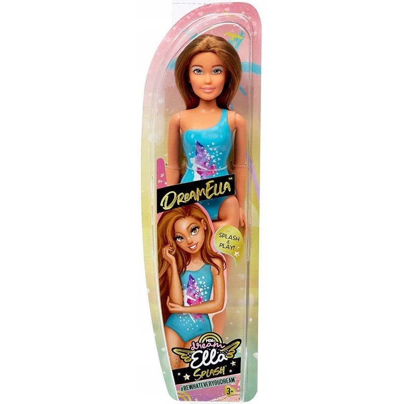 DreamElla ma jasną karnację skóry, piękne brązowe włosy i oczy. lalka jest ubrana w niebieski kostium kąpielowy.