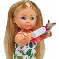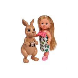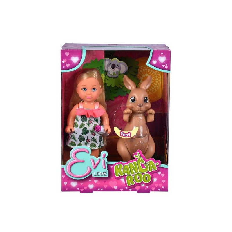 Laleczka Evi z kangurzycą tym razem występuje w ślicznej sukience w modny liściasty nadruk i opiekuje się kangurzycą, która wychowuje swoje maleństwo. Małego kangurka można ukrywać w kieszeni matki, więc scenariuszy zabawy jest naprawdę bardzo wiele. Zabawka jest wyposażona w funkcję try-me. Wysokość lalki wynosi: 12cm.