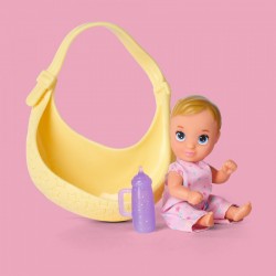 Lalka z chustą doskonale sprawdzi się jako nosidełko do trzymania przy sobie dziecka, dzięki niej dzidziuś w uroczym, różowym stroju może być zawsze blisko swojej mamusi. Dołączona do zestawu butelka, ułatwi codzienną opiekę nad bobaskiem butelka ozdobiona jest brokatem.