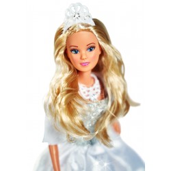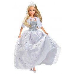 Lalka Steffi w pięknej białej sukni z puszystym bolerkiem. W zestawie również naszyjnik i tiara z błyszczącym kamieniem.