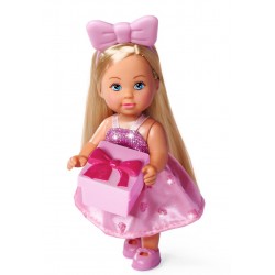 Evi w błyszczącej sukience, z kokardą na głowie i pudełkiem na prezent - niespodzianką.