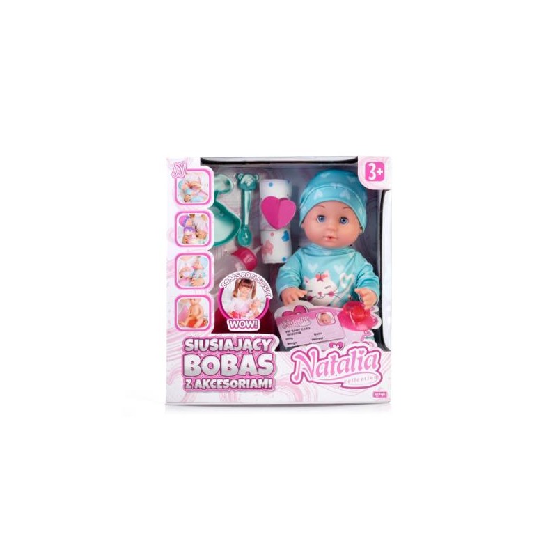 Lalka Bobas siusiający 30cm (piżamka z kotkiem). W zestawie znajduje się pieluszka, łyżka, buteleczka, smoczek, nocnik, talerzyk w kształcie króliczka. Zabawka pozwala na zmianę pieluszki dzidziusiowi, podanie mu smoczka, napojenie go, nakarmienie i ułożenie na nocniku. Dodatki posiadają wytłoczenia, które urealniają produkt. Laleczka jest ubrana w uroczą piżamkę. Na jej głowie znajduje się czapeczka. Bobas zamyka oczy po położeniu go.