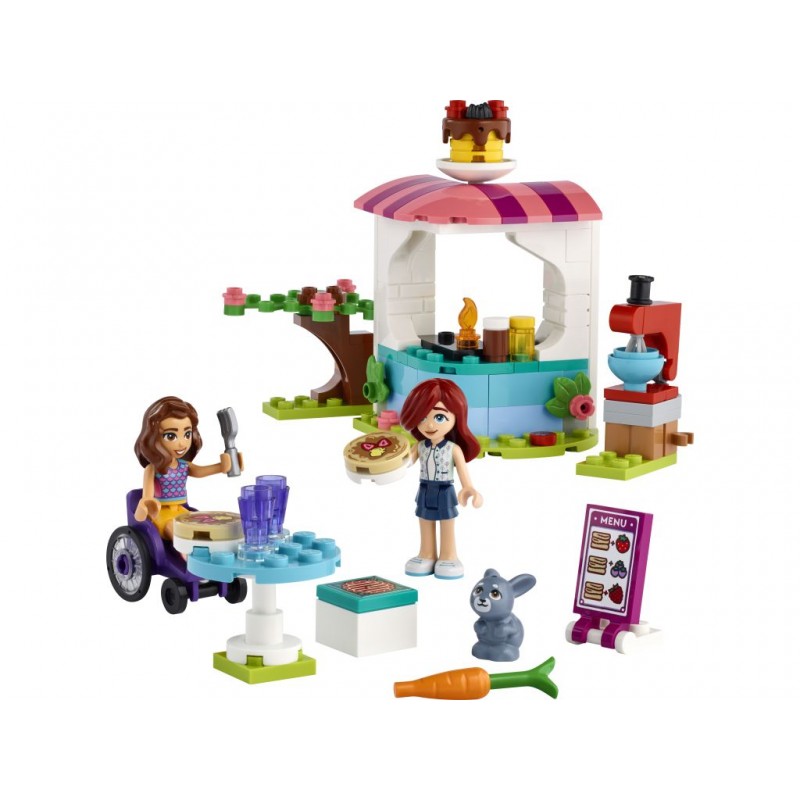 Kreatywne dzieci w wieku od sześciu lat mogą bawić się w odgrywanie ról dzięki zestawowi LEGO Friends Naleśnikarnia. Zobacz, jak dzieci zaprzyjaźniają się z Luną i Paisley. Żądna przygód Luna i nieśmiała Paisley dają z siebie wszystko, jednocześnie dobrze się bawiąc. Zabawkowa naleśnikarnia jest wyposażona w kuchenkę, dodatki do naleśników i obracający się mikser, dzięki czemu dzieci mogą udawać, że przyrządzają smakołyki. Jest też mała kasa fiskalna, stolik i menu do odgrywania ról klientów. Dzieciom spodoba się też obserwowanie króliczka ukrywającego się pod krzakiem. Dzieci mogą cieszyć się łatwym i intuicyjnym budowaniem dzięki aplikacji LEGO Builder. Mogą w niej przybliżać i obracać model w 3D, zapisywać zestawy i śledzić postępy