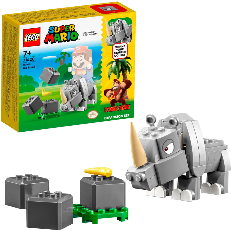 Przygotuj się na przygody z LEGO Super Mario dzięki zestawowi Nosorożec Rambi — zestaw rozszerzający (71420) dla dzieci w wieku od siedmiu lat. Zawiera on zbudowaną z klocków figurkę LEGO Rambiego, na której mogą jeździć interaktywne figurki LEGO Mario, LEGO Luigi lub LEGO Peach (brak w zestawie). Kiedy Rambi chodzi, szarżuje na dołączone skalne elementy, które można układać jeden na drugim, i wykonuje inne ruchy, na interaktywnej figurce włączają się efekty dźwiękowe. Uwaga: do gry interaktywnej wymagany jest zestaw startowy 71360, 71387 lub 71403.