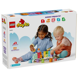 Kreatywna zabawka zapewnia mnóstwo nauki przez zabawę. Gdy maluchy łączą przyczepkę z zabawkową ciężarówką i pomagają dwóm figurkom LEGO DUPLO w ładowaniu i rozładowywaniu klocków, zaczynają rozpoznawać litery, uczyć się kolorów, doskonalić swój język i rozwijać koordynację wzrokowo-ruchową. Rozwijające wyobraźnię akcesoria obejmują zabawkową książeczkę z alfabetem LEGO DUPLO i element z radiem, które zachęcają rodziców i małe dzieci do wspólnego śpiewania alfabetu. Ta edukacyjna zabawka zachęca małe dzieci do wymyślania kreatywnych historii, w których wsiadają do kabiny ciężarówki i wyruszają na nową przygodę!