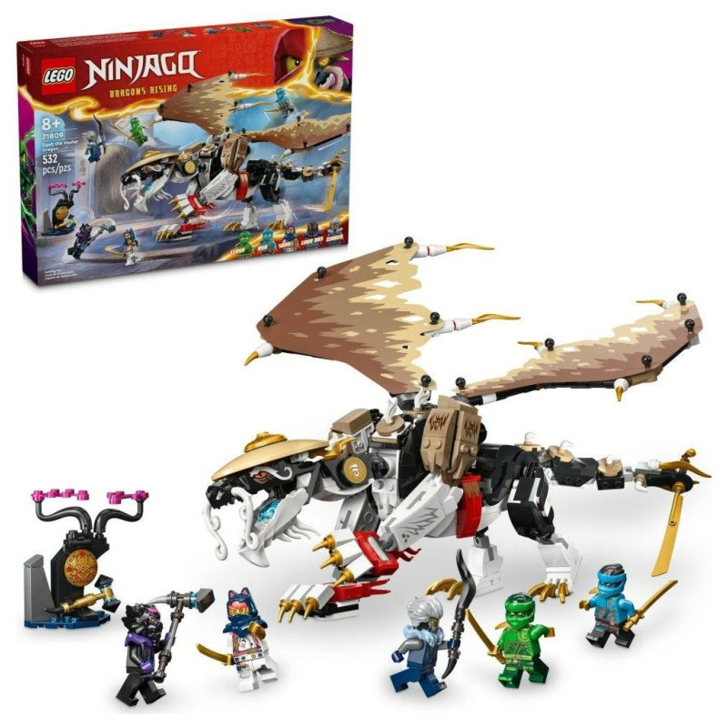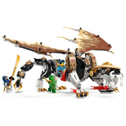 Jest to pierwsza w historii zabawka smoczego mistrza z serii NINJAGO, która ma ruchome nogi, ogon, głowę i foliowe skrzydła, miecz oraz uchwyt na katanę na plecach. W tym zestawie znajduje się pięć minifigurek — wojownicy ninja Lloyd, Sora i Nya, wszyscy uzbrojeni w miecze oraz złowieszczy duet: Lord Ras z młotkiem i Cinder z mieczem — dzięki czemu dzieci mogą odgrywać bitwy w stylu ninja. Całości dopełnia małe, zbudowane z klocków drzewo, na którym znajdują się młot roztrzaskania i gong roztrzaskania, o które walczą postacie NINJAGO. Seria zabawek ninja do zbudowania dla dzieci LEGO NINJAGO obejmuje mechy, pojazdy i świątynie, dzięki czemu fani mogą odgrywać niesamowite przygody. Każdy zestaw bitewny można zbudować z pomocą aplikacji LEGO Builder, która poprowadzi Ciebie i Twoje dziecko przez łatwą i intuicyjną przygodę z budowaniem.