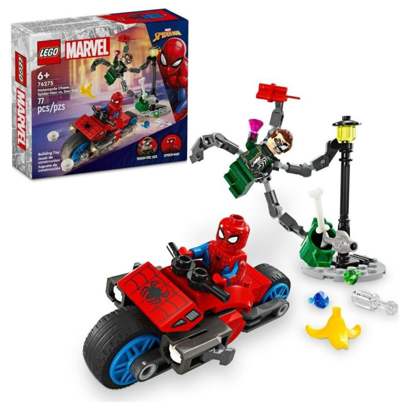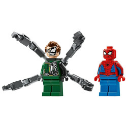Spider-Man kontra Doc Ock — w zestawie jest motocykl Spider-Mana do zbudowania z dwoma miotaczami klocków oraz dwie minifigurki: Spider-Man z dwoma miotaczami sieci i Doc Ock z czterema długimi, elastycznymi mackami