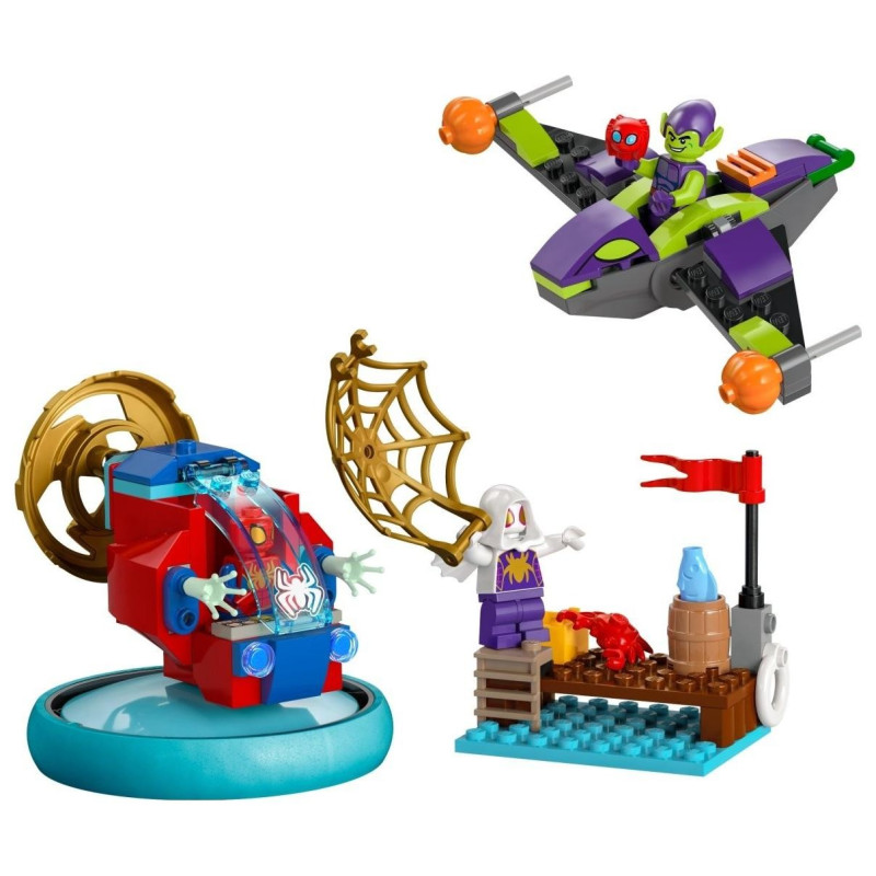 Zestaw z serialu Disney+ Spidey i super-kumple zawiera: minifigurkę Spider-Mana i jego latający spinner z obrotowym śmigłem i podnoszonym kokpitem, minifigurkę Zielonego Goblina i jego szybowiec z dyniowymi pociskami oraz minifigurkę Ghost-Spider z dużą złotą siecią. Jest tu także przyjaciel Spider-Mana, robot Trace-E, morskie akcesoria i uroczy krab. Zestaw zawiera klocek startowy z kokpitem, który ułatwia rozpoczęcie budowania, oraz intuicyjne instrukcje w formie kolorowego, ilustrowanego przewodnika. W pudełku znajdują się klocki umożliwiające szybkie zbudowanie modelu i postaci, dzięki czemu zabawa może się szybko rozpocząć.