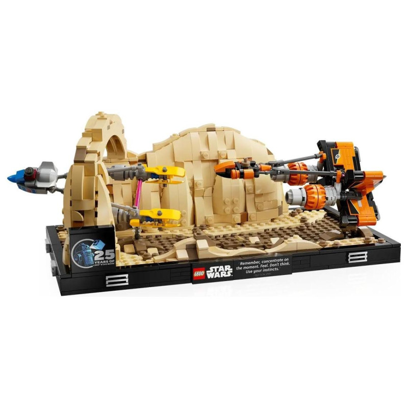 Model do postawienia na półce — zestaw zawiera odcinek z kanionem toru do wyścigów ścigaczy w Mos Espa na Tatooine, a także klocek z okazji25-lecia zestawów LEGO Star Wars oraz tabliczkę z cytatem z Qui-Gon Jinna