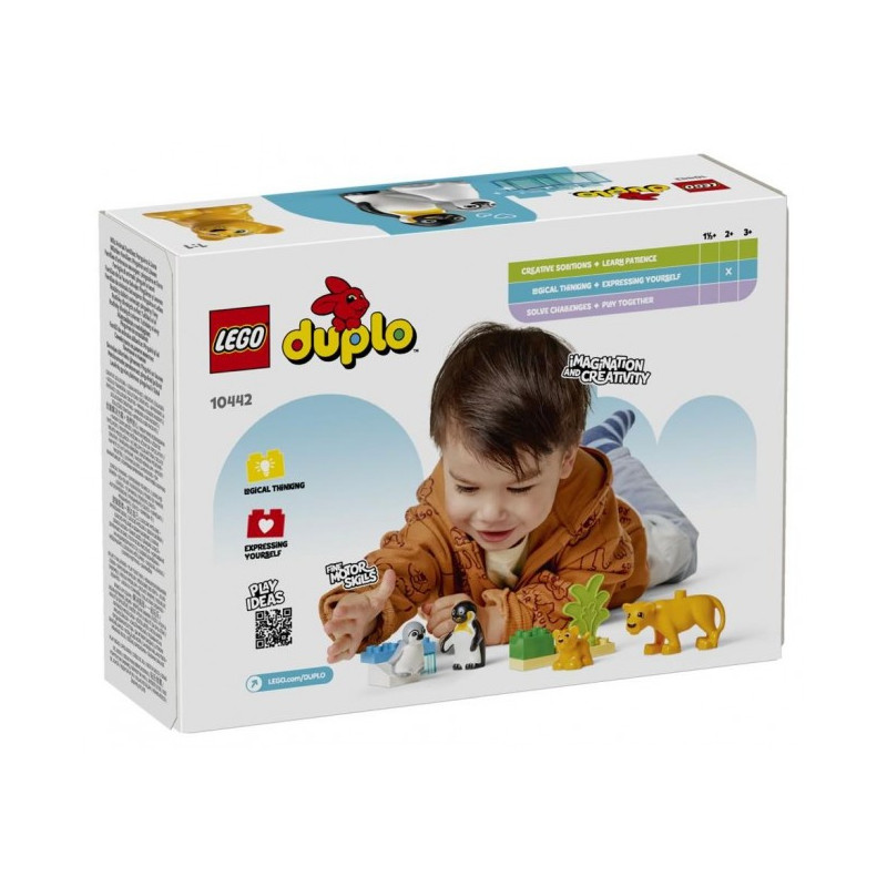 Wyrusz w edukacyjną podróż ze swoją pociechą w wieku od dwóch lat i pokaż jej Antarktydę oraz Afrykę podczas zabawy zestawem LEGO DUPLO Rodziny dzikich zwierząt: pingwiny i lwy (10442). Zawiera on dwa pingwiny i dwa lwy LEGO DUPLO, aby zachęcić najmłodszych do wielu godzin twórczej zabawy. Wskaż dziecku różnice między rodzicami a dziećmi oraz między gorącym a mroźnym klimatem. Pomóż mu wyrazić siebie podczas zabawy, pokazując, jak dorosłe zwierzę troszczy się o młode. Pokaż też, że rodzice uwielbiają bawić się z dziećmi, zupełnie jak Wy! Wspólnie zbudujcie lodową ślizgawkę dla pingwinów i łąki dla lwów. Ponadto podczas budowania Twoja pociecha rozwinie koordynację wzrokowo - ruchową.