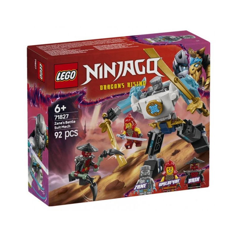 Zestaw LEGO NINJAGO Mech w zbroi bojowej Zane’a (71827) umożliwia sześciolatkom i starszym dzieciom odtwarzanie ekscytujących akcji z trzeciego sezonu serialu telewizyjnego NINJAGO: Powstanie Smoków. Zawiera on mecha NINJAGO z ruchomymi rękami, nogami i dłońmi, obrotowym tułowiem, otwieranym korpusem, w którym można umieścić minifigurkę, oraz dwoma dużymi mieczami. Ten zestaw LEGO zawiera trzy minifigurki postaci NINJAGO: Zane’a z dwoma shurikenami, Wyldfyre z kryształową kataną i Drixa, Władcę Roju z Zakazanej Piątki, z dwoma sierpami. Dzięki temu dzieci mogą cieszyć się wielogodzinną zabawą w świecie NINJAGO.