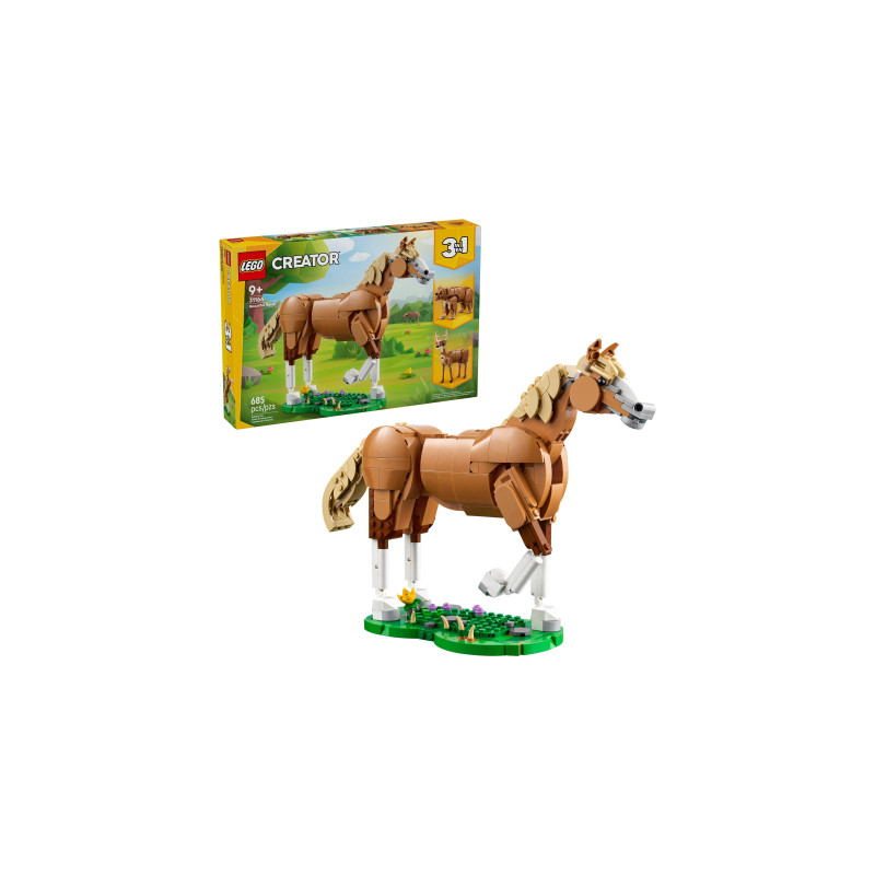 Dzięki zestawowi, dziewczynki i chłopcy w wieku od dziewięciu lat, którzy uwielbiają zwierzęta, mogą odgrywać ciekawe historie. Ruchoma figurka konia może poruszać głową, szyją, biodrami, pęcinami, ogonem i jednym z kolan. Ponadto ma podstawkę imitującą trawę, dzięki czemu dzieci mogą ją ustawiać w trzech różnych pozach: na stojąco na trzech lub czterech nogach lub w pozie na dwóch tylnych nogach. Dzieci mają trzy różne opcje budowania z tego samego zestawu klocków: ruchomą figurkę LEGO konia, niedźwiedzia z małym wodospadem lub eleganckiego jelenia. Wszystkie trzy figurki zwierząt w tym zestawie do przebudowywania świetnie się sprawdzą jako kreatywny prezent dla dzieci. Zestawy LEGO Creator 3 w 1 pobudzają wyobraźnię dzieci dzięki trzem różnym modelom do zbudowania w jednym pudełku. Można je budować i przebudowywać do woli. Różnorodność modeli sprawia, że zestawy trafią w każdy gust: miłośników superszybkich pojazdów, niesamowitych zwierząt czy szczegółowych budynków. Należy pamiętać, że nie można zbudować trzech modeli jednocześnie.