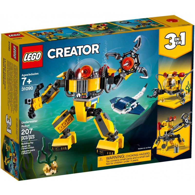 Zestaw klocków LEGO 31090 Podwodny robot z serii Creator.Zestaw zawiera 207 elementów potrzebnych do zbudowania robota.Model ma funkcję 3 w 1 możesz ją przebudować w jeszcze 2 inne pojazdy.Wiek 7+ Ostrzeżenie:Nieodpowiednie dla dzieci w wieku poniżej 36 miesięcy. Małe części.