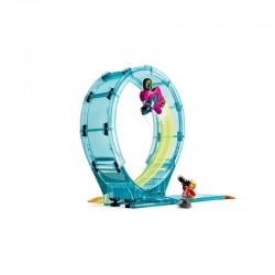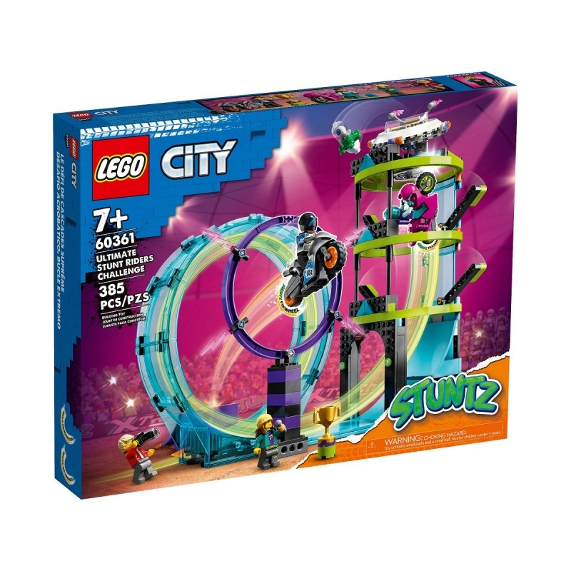 zestaw dla dzieci w wieku od siedmiu lat zawiera dwa zabawkowe motocykle kaskaderskie i trzy łączone atrakcje kaskaderskie, w tym pętlę 360°, ognistą obręcz i fajne wyzwanie „Wieża obcych”. Dzieci mogą sprawdzić swoje umiejętności, organizować super pokazy i rywalizować z przyjaciółmi i rodziną o trofeum zwycięzcy. Ten zestaw LEGO City Stuntzzawiera drukowaną instrukcję budowania oraz aplikację LEGO Builder na smartfony i tablety z intuicyjnymi narzędziami do powiększania i obracania, które pozwalają dzieciom oglądać modele pod każdym kątem podczas budowania.
