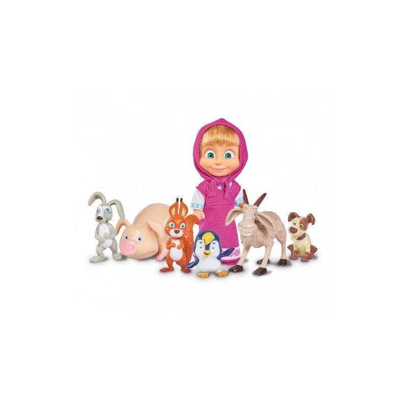 Masza i przyjaciele firmy Simba. Zestaw składający się laleczki Maszy oraz 6 zwierzątek, przyjaciół pochodzących z serialu animowanego. Wysokość lalki 12 cm Wiek 3+
