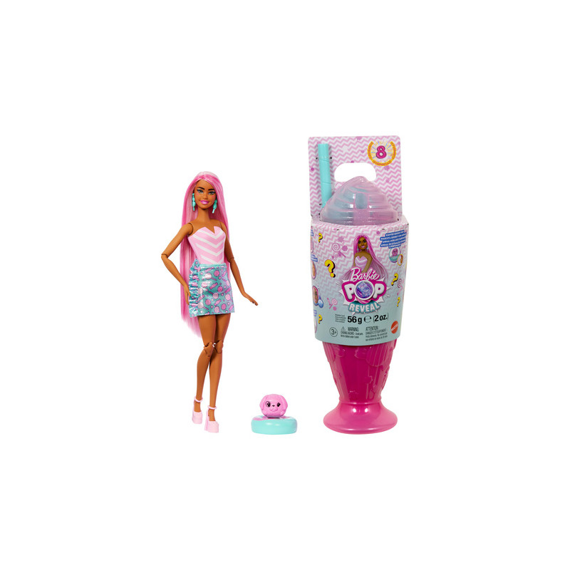 Zestaw z serii Pop Reveal, w którym zabawa polega na odkrywaniu ukrytych elementów w opakowaniu przypominającym deser. W środku znajduje się lalka Barbie oraz osiem niespodzianek, w tym akcesoria modowe, pachnące zwierzątko i dodatki do stylizacji. Lalka ma słodki, „deserowy” motyw (np. babeczka, cukierek), długie włosy i zapachowy akcent. Część elementów reaguje na temperaturę wody – dekoracje na twarzy pojawiają się w zimnej wodzie i znikają w ciepłej.