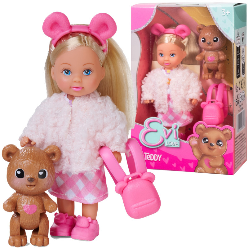 Mała laleczka, która zapewni dzieciakom dużo zabawy, nauczą opiekować się zwierzątkami. Lalka posiada różowy plecaczek i jej ulubionego misia. Evi ma długie blond włosy, błękitne oczy i piękny uśmiech.