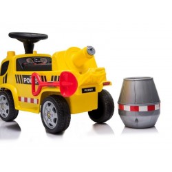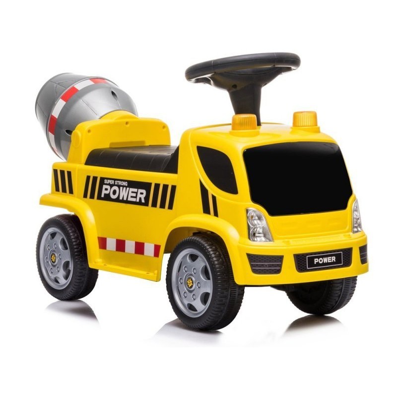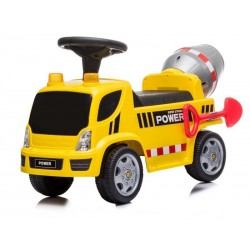Jeździk nauczy utrzymywania odpowiedniej pozycji, wzmocni gorset mięśniowy dziecka, pobudzi jego zmysł słuchu i wzroku. Pojazd posiada w tylnej części obrotową gruszkę, w której transportuje się sypkie materiały lub będzie tworzyć beton— gruz, piach, żwir w realistycznym odpowiedniku. Łopata przymocowana z boku pojazdu będzie służyć prostym pracom. Podczas efektów dźwiękowych możemy zauważyć świecące się koguty oraz światła z przodu autka. W zestawie znajduje się instrukcja działania, złożenia oraz naklejki imitujące przycisk jak w autku na akumulator.