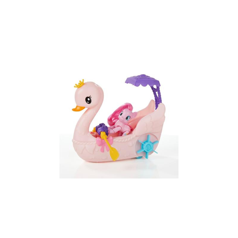 Łabędzie łódka Pinkie Pie firmy Hasbro. Łódka zabierze Cię do magicznego świata Kucyków. Wyposażona jest w fioletowy daszek który chroni przed słońcem oraz niebieski wirnik uruchamiający melodię z bajki. Zestaw zawiera łabędzią łódź z wiosłami oraz figurkę Pinkie Pie. Wiek 3+ Uwaga:Nieodpowiednie dla dzieci w wieku poniżej 3 lat ze względu na ryzyko udławienia małymi elementami.