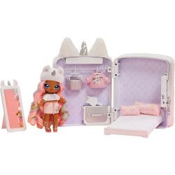 Rozpakuj niesamowity zestaw 3w1, zawierający rozkoszną, miękką laleczkę i pluszowy plecak w kształcie głowy białego jednorożca oraz akcesoria do stworzenia scenerii – sypialni.