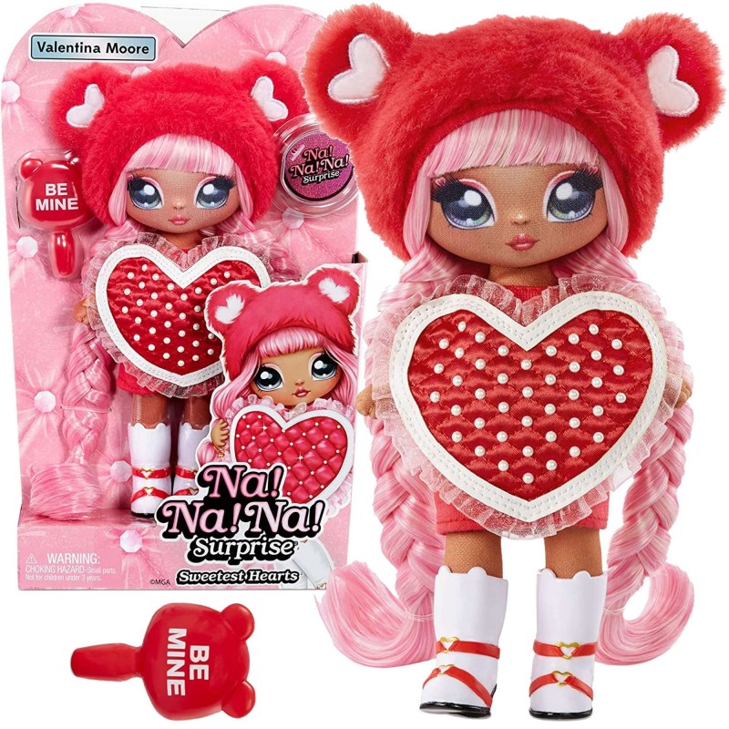 Miękkie lalki do przebierania. Lalki ubrane są w pikowane sukienki w kształcie cukierkowych serc i koszulki pod spodem. Na! Na! Na! Lalki Surprise to pierwsze miękkie lalki do przebierania, które można dowolnie ustawiać, z nadrukowaną twarzą i modnymi detalami. Teraz w przezroczystym opakowaniu, aby zaprezentować wszystkie wysokiej jakości detale i ułatwić kolekcjonowanie!