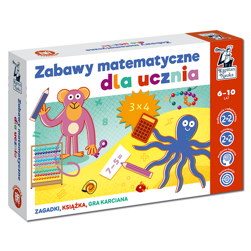Zabawy matematyczne dla ucznia to zestaw motywujący do ćwiczeń z liczbami dla uczniów szkół podstawowych. Połączenie zabawy z nauką buduje pozytywne skojarzenia związane z nauką działań matematycznych. Dzięki zadaniom, dzieci nauczą się rachować z pamięci, mnożyć, dzielić oraz łączyć fakty, rozumieć związki przyczynowo - skutkowe i analizować informacje. Zadania w formie łamigłówek logicznych, zagadek obrazkowych oraz gry edukacyjnej pozwolą opanować podstawy matematyki intuicyjnie. Proste sytuacje z życia codziennego wplecione w fabułę zadań pomogą odkrywać świat matematycznych zagadek i podchodzić do nich z ciekawością.