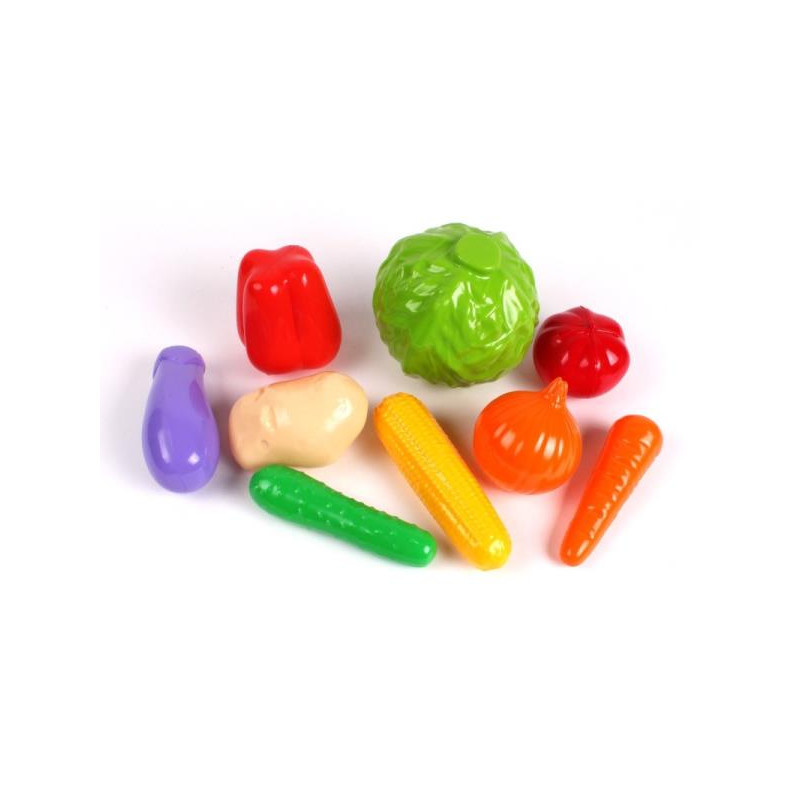 W zestawie znajdziemy następujące warzywa: kapusta, marchewka, kukurydza, pomidor, bakłażan, papryka, ogórek, cebula, ziemniak. Faktura każdego produktu odwzorowuje cechy z rzeczywistości. Na przykład kolba kukurydzy posiada wyżłobienia, które imitują pojedyncze ziarenka. Z kolei na kapuście znajdują się charakterystyczne nierówności, które dobrze imitują powierzchnię liści. Komplet przydaje się do zabawy w sklep oraz w kuchnię.