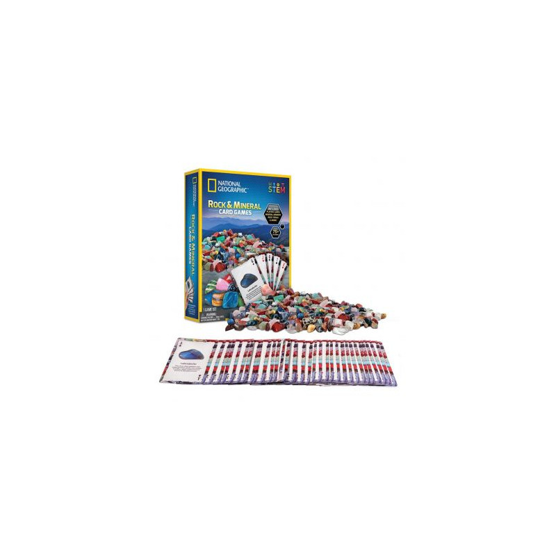 Zestaw kart do gry National Geographic Skały i minerały zawiera standardową talię 52 kart i ponad 75 prawdziwych kamieni szlachetnych! Możesz grać we wszystkie swoje ulubione gry karciane, a dodatkowo na każdej karcie znajduje się zdjęcie kamienia szlachetnego, skały lub minerału wraz ze stosowną informacją lub ciekawostką, dzięki czemu ten zestaw doskonale nadaje się również do zabawy w quizy i do gier pamięciowych. W zestawie znajdują się instrukcje do gier pamięciowych i quizów, a także wygodna torba do przechowywania wszystkich nowych okazów.