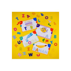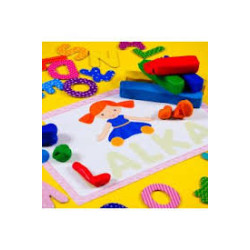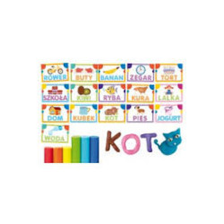 Zawartość: kształty liter, karty ze słowami, plastelina w 6 kolorach, instrukcja.