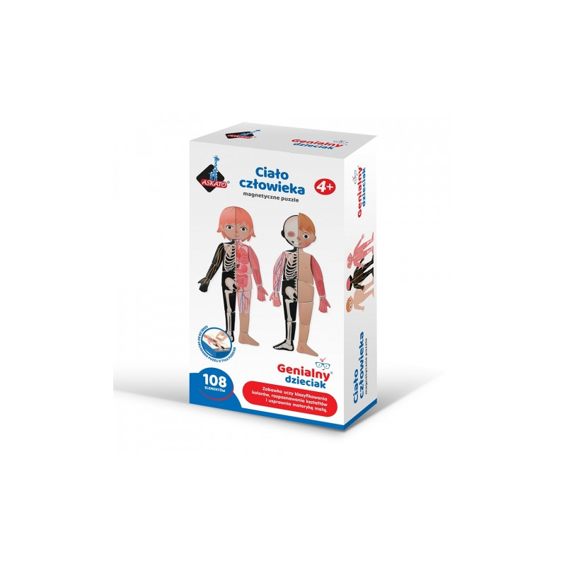 Puzzle magnetyczne, które w formie zabawy uczą anatomii człowieka. Zestaw zawiera 108 elementów magnetycznych do ułożenia 6 plansz tematycznych (m.in. szkielet, mięśnie, układ nerwowy, narządy). Dziecko poznaje budowę ciała etapami, rozwijając koncentrację, logiczne myślenie i motorykę.