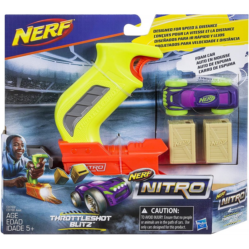 Nerf Nitro Throttleshot Blitz firmy Hasbro. Zestaw zawiera wyrzutnię, dwie przeszkody- opony oraz piankowy samochodzik. Ustaw tor przeszkód lub cel albo rozpocznij prawdziwy wyścig. Wiek 5+