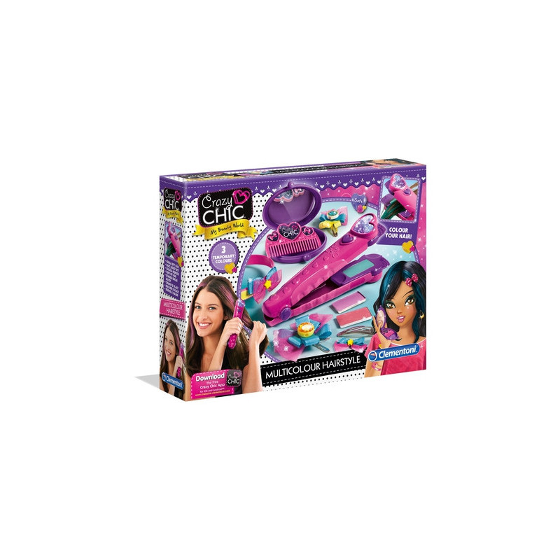 Crazy Chic Fryzury firmy Clementoni. Wykonaj super fryzurę w stylu Crazy Chic z kolorowymi pasemkami. Zestaw zawiera prostownicę do ozdabiania włosów, grzebień, lusterko oraz kolorowe ozdoby.