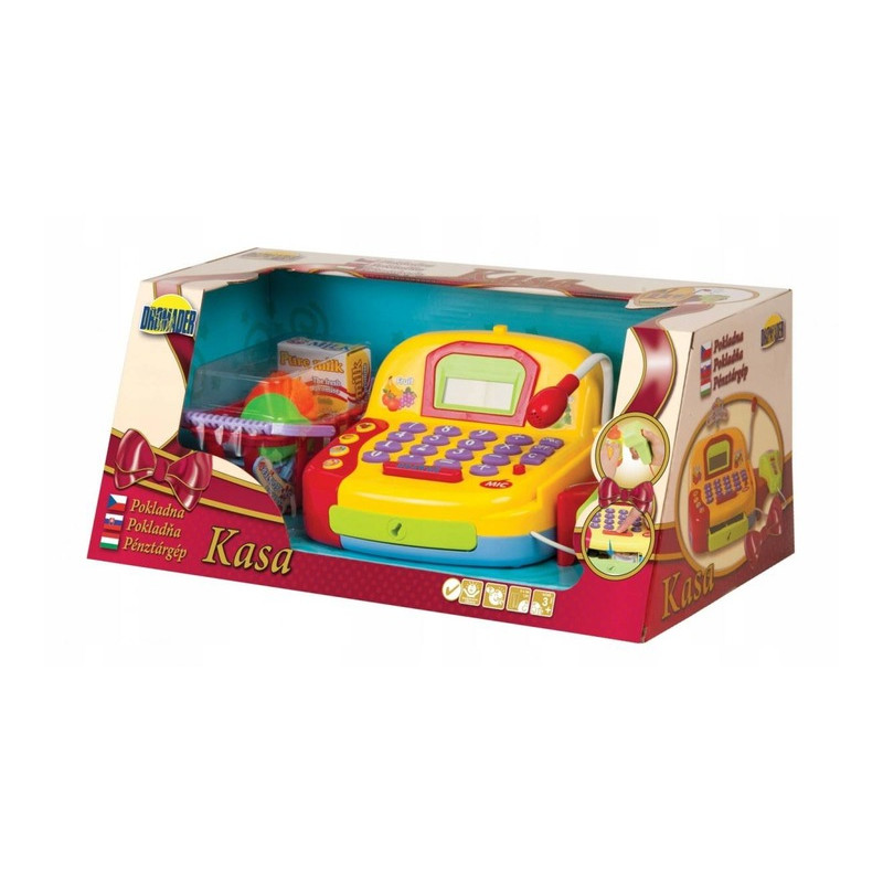 Zestaw zawiera kasę z czytnikiem kodów kreskowych i mikrofonem oraz koszyk z zakupami.