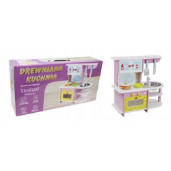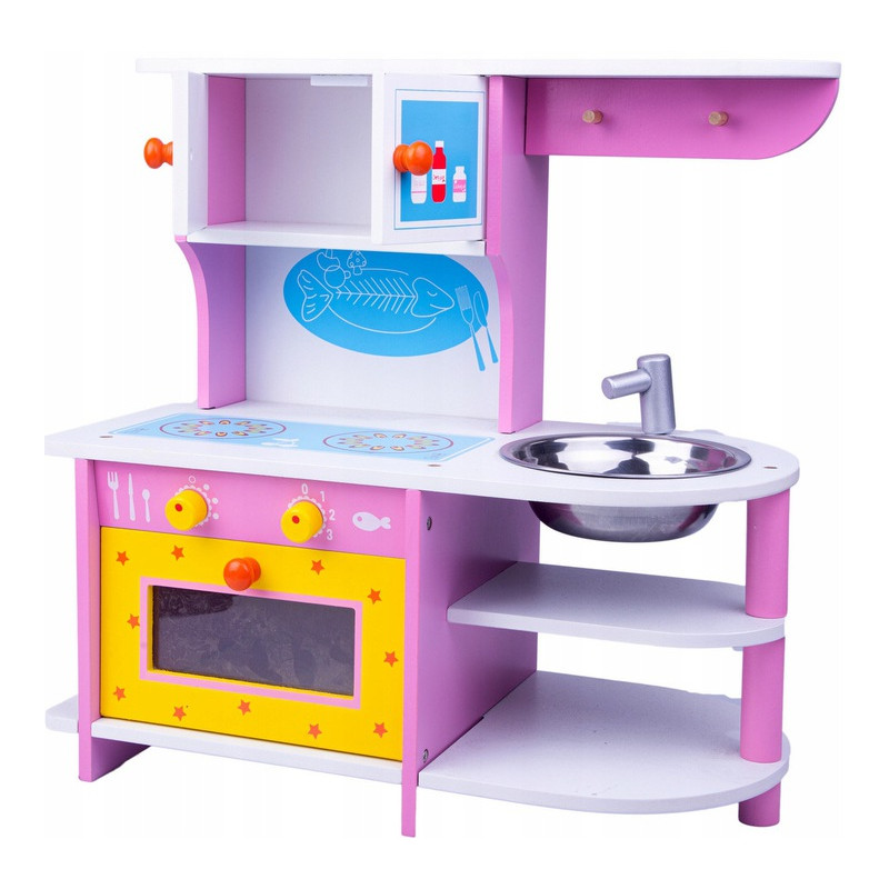 Drewniana kuchnia dla dzieci. Całość malowana na wesołe dziecięce kolory. Kuchnia posiada otwierany piekarnik, szafkę dolną z półeczką. Na blacie znajdują się imitacje palników, mamy tu również zlewozmywak z kranem. Pod blatem szafka piekarnika a nad blatem szafka. W zestawie również rondelek z pokrywką, garnek, patelnia, nóż itp.