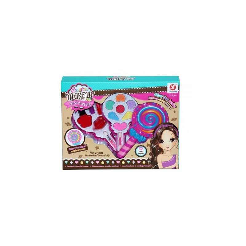 Askato Kosmetyki dla lalek w pudełku o kształcie lizaka. Świetnie sprawdzi się dla małej księżniczki lubiącej make-up. Zestaw zawiera:
